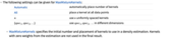 uniformly spaced kernels{spec1,spec2,…} use spec1, spec2, … in different dimensions - MaxMixtureKernels specifies the initial number and placement of kernels to use in a density estimation. Kernels with zero weights from the estimation are not used in the final result.