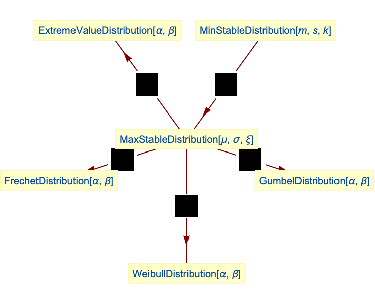 - The max-stable distribution is related to a number of other distributions. MaxStableDistribution generalizes a number of distributions, including ExtremeValueDistribution (ExtremeValueDistribution[α,β] is the same as MaxStableDistribution[α,β,0]) and FrechetDistribution (FrechetDistribution[α,β] is precisely MaxStableDistribution[β,β/α ,1/α]). It can be transformed to obtain the distribution functions for MinStableDistribution, GumbelDistribution, and WeibullDistribution. MaxStableDistribution is also related to ExponentialDistribution, ExpGammaDistribution, and LogisticDistribution.