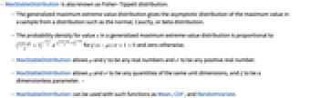 . (This behavior can be made quantitatively precise by analyzing the SurvivalFunction of the distribution.) Along with the min-stable distribution, the max-stable distribution is a so-called "extreme value distribution" and may be referred to as the generalized maximum extreme value distribution, a type-1 extreme value distribution (not to be confused with ExtremeValueDistribution), a Gumbel maximum distribution (not to be confused with GumbelDistribution), and a Fisher–Tippett distribution. - The generalized maximum extreme value distribution is the unique distribution modeling the asymptotic behavior of the maximum value in a sample from a distribution like the NormalDistribution, CauchyDistribution, or BetaDistribution. It was developed to combine the behaviors of other extreme value distributions such as the GumbelDistribution, FrechetDistribution, and WeibullDistribution. Because its PDF is doubly exponential (i.e. is of the form Exp[-Exp[…]]), the graph of the distribution has more exaggerated features (like higher peaks and thinner tails), a property unique among distributions. The max-stable distribution is a cornerstone in the field known as extreme value theory and is widely utilized to describe situations that are "extremely unlikely" (i.e. those in which datasets consist of variates with extreme deviations from the median). It been used to model a number of phenomena in various subfields of finance and economics.