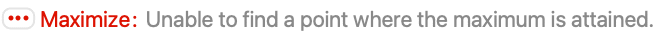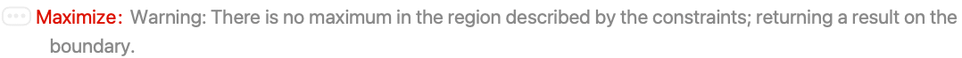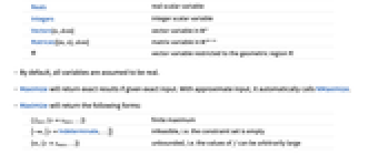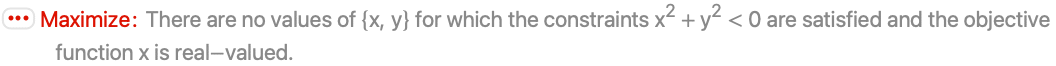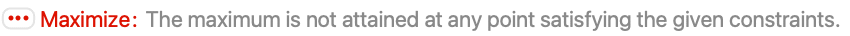 {fmax,{xxmax,…}} finite maximum {-∞,{xIndeterminate,…}} infeasible, i.e. the constraint set is empty {∞,{xxmax,…}} unbounded, i.e. the values of f can be arbitrarily large - If the maximum is achieved only infinitesimally outside the region defined by the constraints, or only asymptotically, Maximize will return the supremum and the closest specifiable point.
