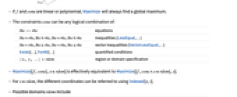 - If f and cons are linear or polynomial, Maximize will always find a global maximum.