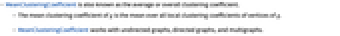 - MeanClusteringCoefficient is also known as the average or overall clustering coefficient.