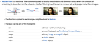 list arbitrary-rank numerical array tseries temporal data such as TimeSeries, TemporalData, … image arbitrary Image or Image3D object audio an Audio object video a Video object - For multichannel images, MedianFilter replaces each pixel by a pixel in its neighborhood that has the median total intensity.