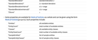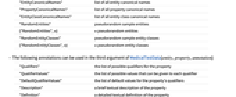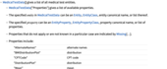 "Entities" all available entities "EntityCount" total number of available entities "Classes" all available entity classes "EntityClassCount" total number of available entity classes "SampleEntities" list of sample entities "SampleEntityClasses" list of sample entity classes "EntityCanonicalNames" list of all entity canonical names "PropertyCanonicalNames" list of all property canonical names "EntityClassCanonicalNames" list of all entity class canonical names "RandomEntities" pseudorandom sample entities {"RandomEntities",n} n pseudorandom entities "RandomEntityClasses" pseudorandom sample entity classes {"RandomEntityClasses",n} n pseudorandom entity classes - The following annotations can be used in the third argument of MedicalTestData[entity,property,annotation]: