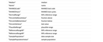 "AlternateNames" alternate names "BMIDistributionPlot" distribution "CPTCode" CPT code "DistributionPlot" distribution "Mean" mean "Median" median "Name" name "NHANESCode" NHANES test code "NHANESYears" NHANES test cycles "NormalRange" 95% reference range "PercentileAboveValue" fraction above "PercentileBelowValue" fraction below "PercentileValue" test value "PlausibleRange" plausible range "ReferenceRange90" 90% reference range "ReferenceRange99" 99% reference range "SamplePopulation" data sample size "SamplePopulationValue" sample population "StandardDeviation" standard deviation σ "StandardDeviation2" 2σ standard deviation "StandardDeviationInterval" ±1σ range "StandardDeviationInterval2" ±2σ range "ZScore" z - Some properties are available for MedicalTestData as a whole and can be given using the form MedicalTestData[property]. Such properties include: