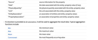"Qualifiers" the list of possible qualifiers for the property "QualifierValues" the list of possible values that can be given to each qualifier "DefaultQualifierValues" the list of default values for the property's qualifiers "Description" a brief textual description of the property "Definition" a detailed textual definition of the property "Source" source information for the property "Date" the date associated with the entity-property value (if any) "PhysicalQuantity" the physical quantity associated with the entity-property value "Unit" the unit associated with the entity-property value "EntityAssociation" an association of entities and entity-property values "PropertyAssociation" an association of properties and entity-property values - If a function is provided as an annotation, it will be used to aggregate the result data. Typical aggregation functions include: