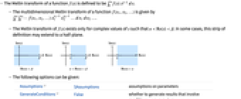 Assumptions $Assumptions assumptions on parameters GenerateConditions False whether to generate results that involve conditions on parameters Method Automatic what method to use - In TraditionalForm, MellinTransform is output using
