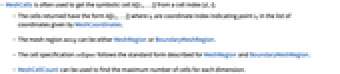 - MeshCells is often used to get the symbolic cell h[{i1,…}] from a cell index {d,i}.