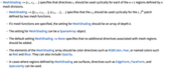 - MeshShading->{{c11,c12,…},{c21,…},…} specifies that the cij should be used cyclically for the i,j
