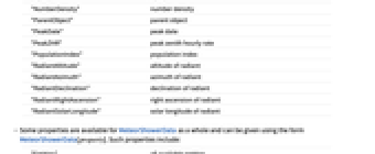 - MeteorShowerData["Properties"] gives a list of available properties.