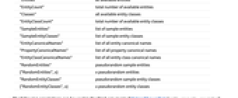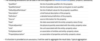 "Qualifiers" the list of possible qualifiers for the property "QualifierValues" the list of possible values that can be given to each qualifier "DefaultQualifierValues" the list of default values for the property's qualifiers "Description" a brief textual description of the property "Definition" a detailed textual definition of the property "Source" source information for the property "Date" the date associated with the entity-property value (if any) "PhysicalQuantity" the physical quantity associated with the entity-property value "Unit" the unit associated with the entity-property value "EntityAssociation" an association of entities and entity-property values "PropertyAssociation" an association of properties and entity-property values - If a function is provided as an annotation, it will be used to aggregate the result data. Typical aggregation functions include:
