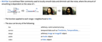 list arbitrary-rank numerical array tseries temporal data such as TimeSeries, TemporalData, … image arbitrary Image or Image3D object audio an Audio object video a Video object - For multichannel images, MinFilter replaces each pixel by a pixel in its neighborhood that has the minimum total intensity, averaged over all channels.