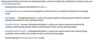 - Classify[data,…,MissingValueSynthesissynth] can be used to specify a missing synthesis method or model for training (and similarly for other training functions).