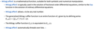 - MittagLefflerE is typically used in the solution of fractional-order differential equations, similar to the Exp function in the solution of ordinary differential equations.