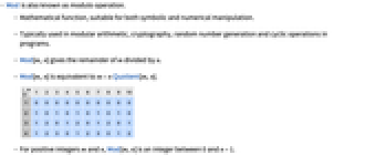 - Mod[m,n] is equivalent to m-n Quotient[m,n].