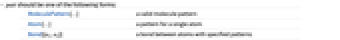MoleculePattern[…] a valid molecule pattern Atom[…] a pattern for a single atom Bond[{a1,a2}] a bond between atoms with specified patterns