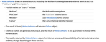 - MoleculeName draws on several sources, including the Wolfram Knowledgebase and external services such as "PubChem" and "ChemSpider".