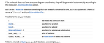 n the index of a particular atom Atom[…] a pattern for an atom Bond[…] a pattern for a bond MoleculePattern[…] a pattern for a molecule substructure {patt1,patt2,…} a list of patterns <|label1patt1,…|> an Association of labels and patterns - Patterns entered as Style[patt,spec]will be styled according to spec.