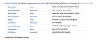 AtomLabels None labels and label placements for atoms AtomLabelStyle Automatic style to use for atom labels BondLabels None labels and label placements for bonds BondLabelStyle Automatic style to use for bond labels Boxed False whether to draw the bounding box ColorRules Automatic a list of rules IncludeHydrogens True whether to show hydrogen atoms PlotLegends None legends for highlights PlotTheme Automatic overall theme for the plot - Supported plot themes include: