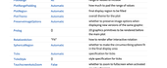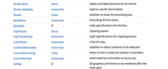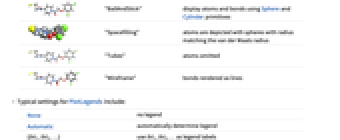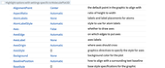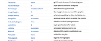 AlignmentPoint Center the default point in the graphic to align with AspectRatio Automatic ratio of height to width AtomLabels None labels and label placements for atoms AtomLabelStyle Automatic style to use for atom labels Axes False whether to draw axes AxesEdge Automatic on which edges to put axes AxesLabel None axes labels AxesOrigin Automatic where axes should cross AxesStyle {} graphics directives to specify the style for axes Background None background color for the plot BaselinePosition Automatic how to align with a surrounding text baseline BaseStyle {} base style specifications for the graphic BondLabels None labels and label placements for bonds BondLabelStyle Automatic style to use for bond labels Boxed False whether to draw the bounding box BoxRatios Automatic bounding 3D box ratios BoxStyle {} style specifications for the box ClipPlanes None clipping planes ClipPlanesStyle Automatic style specifications for clipping planes ColorRules Automatic a list of rules ContentSelectable Automatic whether to allow contents to be selected ControllerLinking False when to link to external rotation controllers ControllerPath Automatic what external controllers to try to use Epilog {} 2D graphics primitives to be rendered after the main plot FaceGrids None grid lines to draw on the bounding box FaceGridsStyle {} style specifications for face grids FormatType TraditionalForm default format type for text ImageMargins 0. the margins to leave around the graphic ImagePadding All what extra padding to allow for labels, etc. ImageSize Automatic absolute size at which to render the graphic IncludeHydrogens True whether to show hydrogen atoms LabelStyle {} style specifications for labels Lighting Automatic simulated light sources to use Method Automatic details of 3D graphics methods to use PlotLabel None a label for the plot PlotLegends None legends for highlights PlotRange All range of values to include PlotRangePadding Automatic how much to pad the range of values PlotRegion Automatic final display region to be filled PlotTheme Automatic overall theme for the plot PreserveImageOptions Automatic whether to preserve image options when displaying new versions of the same graphic Prolog {} 2D graphics primitives to be rendered before the main plot RotationAction "Fit" how to render after interactive rotation SphericalRegion Automatic whether to make the circumscribing sphere fit in the final display area Ticks Automatic specification for ticks TicksStyle {} style specification for ticks TouchscreenAutoZoom False whether to zoom to fullscreen when activated on a touchscreen ViewAngle Automatic angle of the field of view ViewCenter Automatic point to display at the center ViewMatrix Automatic explicit transformation matrix ViewPoint {1.3,-2.4,2.} viewing position ViewProjection Automatic projection method for rendering objects distant from the viewer ViewRange All range of viewing distances to include ViewVector Automatic position and direction of a simulated camera ViewVertical {0,0,1} direction to make vertical