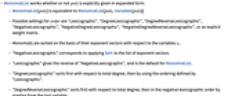 - "NegativeLexicographic" corresponds to applying Sort to the list of exponent vectors.