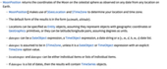 - MoonPosition[…,func] is used to specify the format of output when locations are specified.