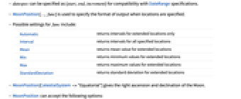 Automatic returns intervals for extended locations only Interval returns intervals for all specified locations Mean returns mean value for extended locations Min returns minimum values for extended locations Max returns maximum values for extended locations StandardDeviation returns standard deviation for extended locations - MoonPosition[CelestialSystem->"Equatorial"] gives the right ascension and declination of the Moon.