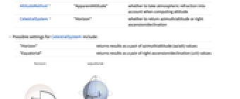 AltitudeMethod "ApparentAltitude" whether to take atmospheric refraction into account when computing altitude CelestialSystem "Horizon" whether to return azimuth/altitude or right ascension/declination - Possible settings for CelestialSystem include: