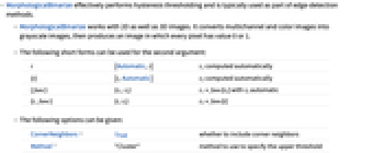 CornerNeighbors True whether to include corner neighbors Method "Cluster" method to use to specify the upper threshold - MorphologicalBinarize[image,{t},Method->method] specifies the method to use to determine the threshold. See the reference page for FindThreshold for full documentation of available methods.