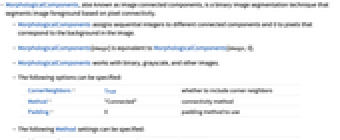 "Connected" labels connected components "Nested" labels nested connected components "Convex" labels objects within non-overlapping convex regions "ConvexHull" finds non-overlapping convex hulls "BoundingBox" finds non-overlapping bounding boxes "BoundingDisk" finds non-overlapping bounding disks - MorphologicalComponents[image,Method->"Connected"] also works with Image3D objects.