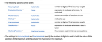AccuracyGoal Automatic number of digits of final accuracy sought EvaluationMonitor None expression to evaluate whenever f is evaluated MaxIterations Automatic maximum number of iterations to use Method Automatic method to use PrecisionGoal Automatic number of digits of final precision sought StepMonitor None expression to evaluate whenever a step is taken WorkingPrecision MachinePrecision the precision used in internal computations - The settings for AccuracyGoal and PrecisionGoal specify the number of digits to seek in both the value of the position of the maximum and the value of the function at the maximum.