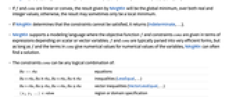 lhs==rhs equations lhs>rhs, lhs≥rhs, lhs<rhs, lhs≤rhs inequalities (LessEqual, …) lhsrhs, lhsrhs, lhsrhs, lhsrhs vector inequalities (VectorLessEqual, …) {x,y,…}∈rdom region or domain specification - NArgMin[{f,cons},x∈rdom] is effectively equivalent to NArgMin[{f,cons&&x∈rdom},x].