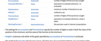 AccuracyGoal Automatic number of digits of final accuracy sought EvaluationMonitor None expression to evaluate whenever f is evaluated MaxIterations Automatic maximum number of iterations to use Method Automatic method to use PrecisionGoal Automatic number of digits of final precision sought StepMonitor None expression to evaluate whenever a step is taken WorkingPrecision MachinePrecision the precision used in internal computations - The settings for AccuracyGoal and PrecisionGoal specify the number of digits to seek in both the value of the position of the minimum, and the value of the function at the minimum.