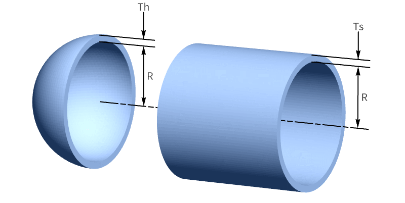 . The shell and cap thicknesses have specified upper and lower limits and must be greater than a fraction of the radius: