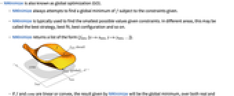 - NMinimize always attempts to find a global minimum of f subject to the constraints given.