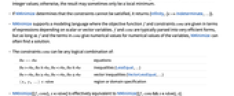 - If NMinimize determines that the constraints cannot be satisfied, it returns {Infinity,{x->Indeterminate,…}}.