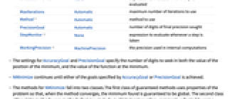 AccuracyGoal Automatic number of digits of final accuracy sought EvaluationMonitor None expression to evaluate whenever f is evaluated MaxIterations Automatic maximum number of iterations to use Method Automatic method to use PrecisionGoal Automatic number of digits of final precision sought StepMonitor None expression to evaluate whenever a step is taken WorkingPrecision MachinePrecision the precision used in internal computations - The settings for AccuracyGoal and PrecisionGoal specify the number of digits to seek in both the value of the position of the minimum, and the value of the function at the minimum.