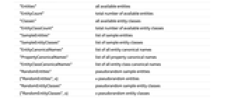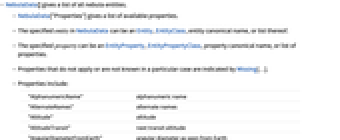"Entities" all available entities "EntityCount" total number of available entities "Classes" all available entity classes "EntityClassCount" total number of available entity classes "SampleEntities" list of sample entities "SampleEntityClasses" list of sample entity classes "EntityCanonicalNames" list of all entity canonical names "PropertyCanonicalNames" list of all property canonical names "EntityClassCanonicalNames" list of all entity class canonical names "RandomEntities" pseudorandom sample entities {"RandomEntities",n} n pseudorandom entities "RandomEntityClasses" pseudorandom sample entity classes {"RandomEntityClasses",n} n pseudorandom entity classes - The following annotations can be used in the third argument of NebulaData[entity,property,annotation]: