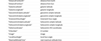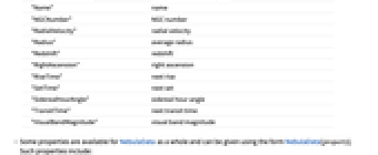 "AlphanumericName" alphanumeric name "AlternateNames" alternate names "Altitude" altitude "AltitudeTransit" next transit altitude "AngularDiameterFromEarth" angular diameter as seen from Earth "AngularRadiusFromEarth" angular radius as seen from Earth "ApparentAltitude" apparent altitude "ApparentMagnitude" apparent magnitude "Azimuth" azimuth "AzimuthRise" azimuth at rise "AzimuthSet" azimuth at set "BlueBandMagnitude" blue band magnitude "BooleanRise" above the horizon "Classes" classes "Constellation" constellation "DailyTimeAboveHorizon" daily time above horizon "Declination" declination "Diameter" average diameter "DistanceFromEarth" distance from Earth "DistanceFromSun" distance from Sun "GalacticLatitude" galactic latitude "GalacticLongitude" galactic longitude "GeocentricEclipticLatitude" geocentric ecliptic latitude "GeocentricEclipticLongitude" geocentric ecliptic longitude "GreenwichHourAngle" Greenwich hour angle "HeliocentricEclipticLatitude" heliocentric ecliptic latitude "HeliocentricEclipticLongitude" heliocentric ecliptic longitude "HelioCoordinates" heliocentric XYZ coordinates "ICNumber" IC number "Image" image "LocalHourAngle" local hour angle "MaximalAltitudeTime" next maximum altitude time "Name" name "NGCNumber" NGC number "RadialVelocity" radial velocity "Radius" average radius "Redshift" redshift "RightAscension" right ascension "RiseTime" next rise "SetTime" next set "SiderealHourAngle" sidereal hour angle "TransitTime" next transit time "VisualBandMagnitude" visual band magnitude - Some properties are available for NebulaData as a whole and can be given using the form NebulaData[property]. Such properties include: