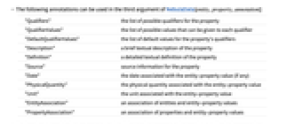 "Qualifiers" the list of possible qualifiers for the property "QualifierValues" the list of possible values that can be given to each qualifier "DefaultQualifierValues" the list of default values for the property's qualifiers "Description" a brief textual description of the property "Definition" a detailed textual definition of the property "Source" source information for the property "Date" the date associated with the entity-property value (if any) "PhysicalQuantity" the physical quantity associated with the entity-property value "Unit" the unit associated with the entity-property value "EntityAssociation" an association of entities and entity-property values "PropertyAssociation" an association of properties and entity-property values - If a function is provided as an annotation, it will be used to aggregate the result data. Typical aggregation functions include:
