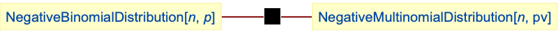 - NegativeMultinomialDistribution is related to a number of other distributions. It is a higher-dimensional generalization of NegativeBinomialDistribution in the sense that the PDF of NegativeBinomialDistribution[n,p] with respect to a variable x is precisely the same as that of NegativeMultinomialDistribution[n,{1-p}] written in terms of the vector {x}. NegativeMultinomialDistribution is also related to BinomialDistribution, MultinomialDistribution, BernoulliDistribution, BetaBinomialDistribution, HypergeometricDistribution, GeometricDistribution, and PoissonDistribution.