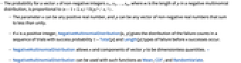 (called a "failure probability vector"), which together define the associated mean, variance, and covariance of the distribution. - The negative multinomial distribution was first investigated in the mid-1950s as a multivariate analogue of the univariate negative binomial distribution (NegativeBinomialDistribution). Analogously to the univariate case, NegativeMultinomialDistribution[n,{p1,p2,…,pm}] for integer n gives the distribution of the failure counts in a sequence of trials with success probability