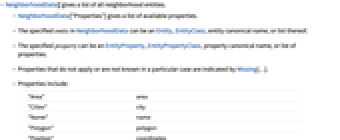 "Area" area "Cities" city "Name" name "Polygon" polygon "Position" coordinates - Some properties are available for NeighborhoodData as a whole and can be given using the form NeighborhoodData[property]. Such properties include: