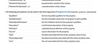 "Qualifiers" the list of possible qualifiers for the property "QualifierValues" the list of possible values that can be given to each qualifier "DefaultQualifierValues" the list of default values for the property's qualifiers "Description" a brief textual description of the property "Definition" a detailed textual definition of the property "Source" source information for the property "Date" the date associated with the entity-property value (if any) "PhysicalQuantity" the physical quantity associated with the entity-property value "Unit" the unit associated with the entity-property value "EntityAssociation" an association of entities and entity-property values "PropertyAssociation" an association of properties and entity-property values - If a function is provided as an annotation, it will be used to aggregate the result data. Typical aggregation functions include: