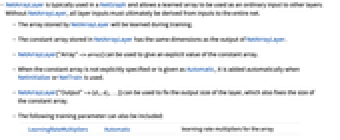 LearningRateMultipliers Automatic learning rate multipliers for the array - NetArrayLayer[…][] returns the constant array.