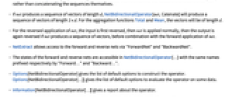 - If net produces a sequence of vectors of length d, NetBidirectionalOperator[net,Catenate] will produce a sequence of vectors of length 2×d. For the aggregation functions Total and Mean, the vectors will be of length d.