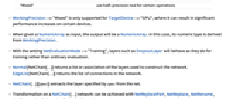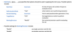 BatchSize Automatic for lists of inputs, the number of inputs to evaluate at once NetEvaluationMode "Test" what mode to use in performing evaluation RandomSeeding Automatic how to seed pseudorandom generators, if any TargetDevice "CPU" the target device on which to perform evaluation WorkingPrecision "Real32" the numerical precision used for evaluating the net - Possible settings for WorkingPrecision include: