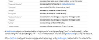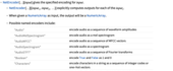"Audio" encode audio as a sequence of waveform amplitudes "AudioMelSpectrogram" encode audio as a mel spectrogram "AudioMFCC" encode audio as a sequence of MFCC vectors "AudioSpectrogram" encode audio as a spectrogram "AudioSTFT" encode audio as a sequence of Fourier transforms "Boolean" encode True and False as 1 and 0 "Characters" encode characters in a string as a sequence of integer codes or one-hot vectors "Class" encode a class label as an integer code or a one-hot vector "FeatureExtractor" encode any kind of input as in FeatureExtraction "Function" use a custom function to encode an input "Image" encode a 2D image as a rank-3 array "Image3D" encode a 3D image as a rank-4 array "SubwordTokens" encode tokens in a string as a sequence of integer codes "Tokens" encode tokens in a string as a sequence of integer codes "UTF8" encode strings as their UTF8 bytes "VideoFrames" encode a video as a sequence of rank-3 arrays - A NetEncoder object can be attached to an input port of a net by specifying "port"->NetEncoder[…] when constructing the net. Specifying "port"->"name" will create an encoder using NetEncoder["name"] and attach it.