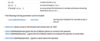 d a vector of size d {d1,d2} a matrix of size d1×d2 {d1,d2,…} an array of shape d1×d2×… {"Varying",d2,d3,…} an array whose first dimension is variable and whose remaining dimensions are d2×d3×… - The following training parameter can be included: