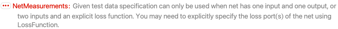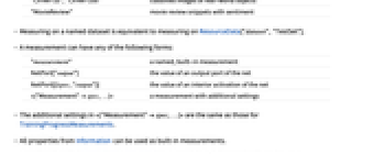 "measurement" a named, built-in measurement NetPort["output"] the value of an output port of the net NetPort[{lspec,"output"}] the value of an interior activation of the net <|"Measurement"spec,…|> a measurement with additional settings - The additional settings in <|"Measurement"spec,…|> are the same as those for TrainingProgressMeasurements.
